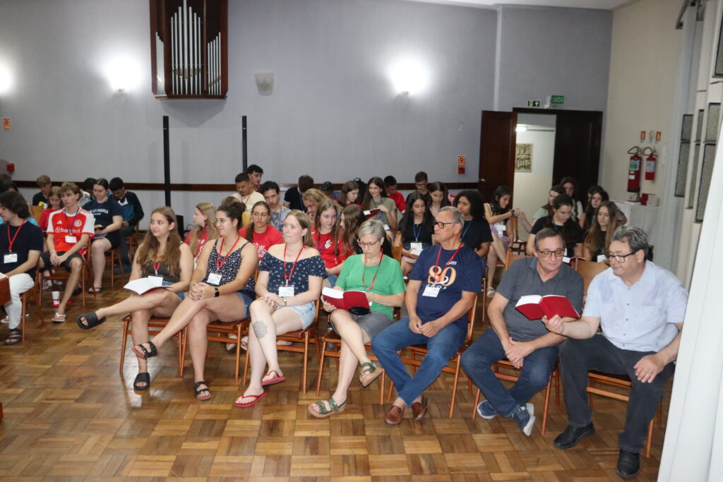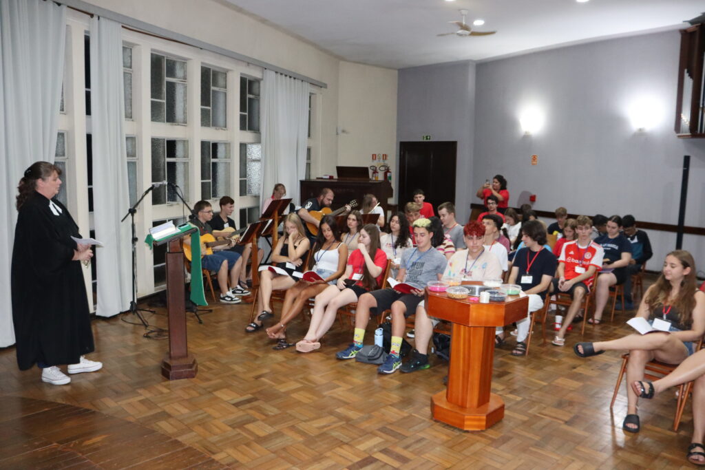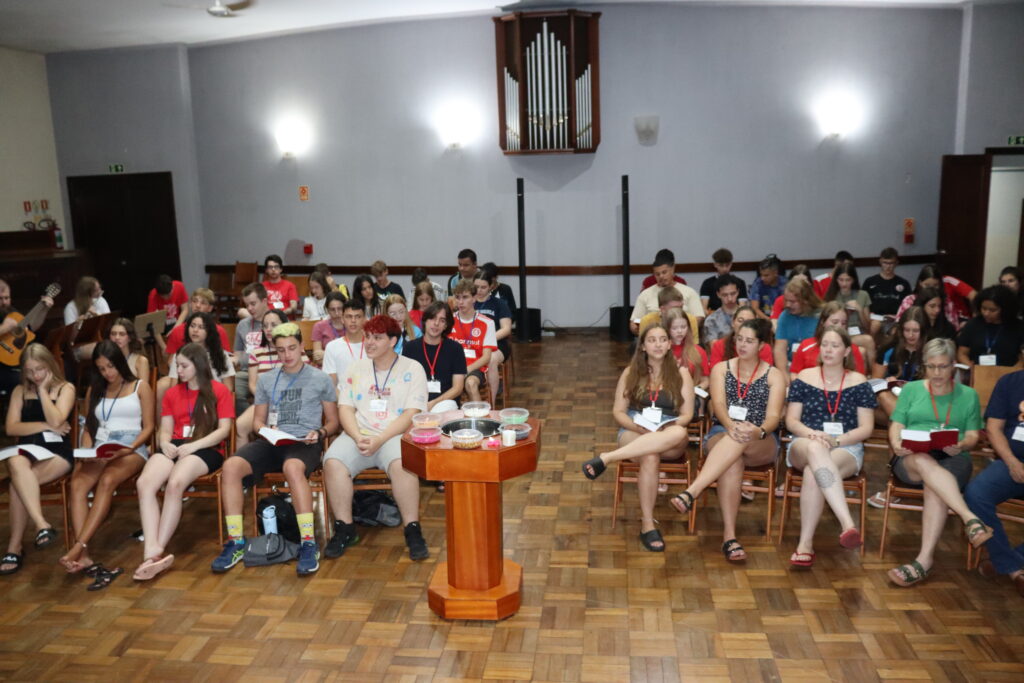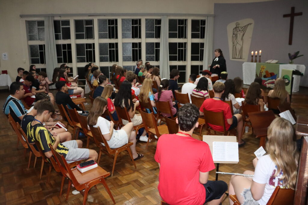 O primeiro dia foi marcado por atividades de integração e o culto de abertura, ministrado pela pastora Cleide Olsson Schneider na capela do prédio S. Com base nos textos bíblicos de Salmo 145.8-21 e Filipenses 4.4-9, as pessoas jovens refletiram sobre a importância e o poder da oração. “Por meio da oração, nos aproximamos ainda mais de Deus, seja de forma coletiva, seja em conversa íntima com Ele, quando buscamos o conforto, agradecemos pelas dádivas ou intercedemos por alguém”, lembrou a ministra.