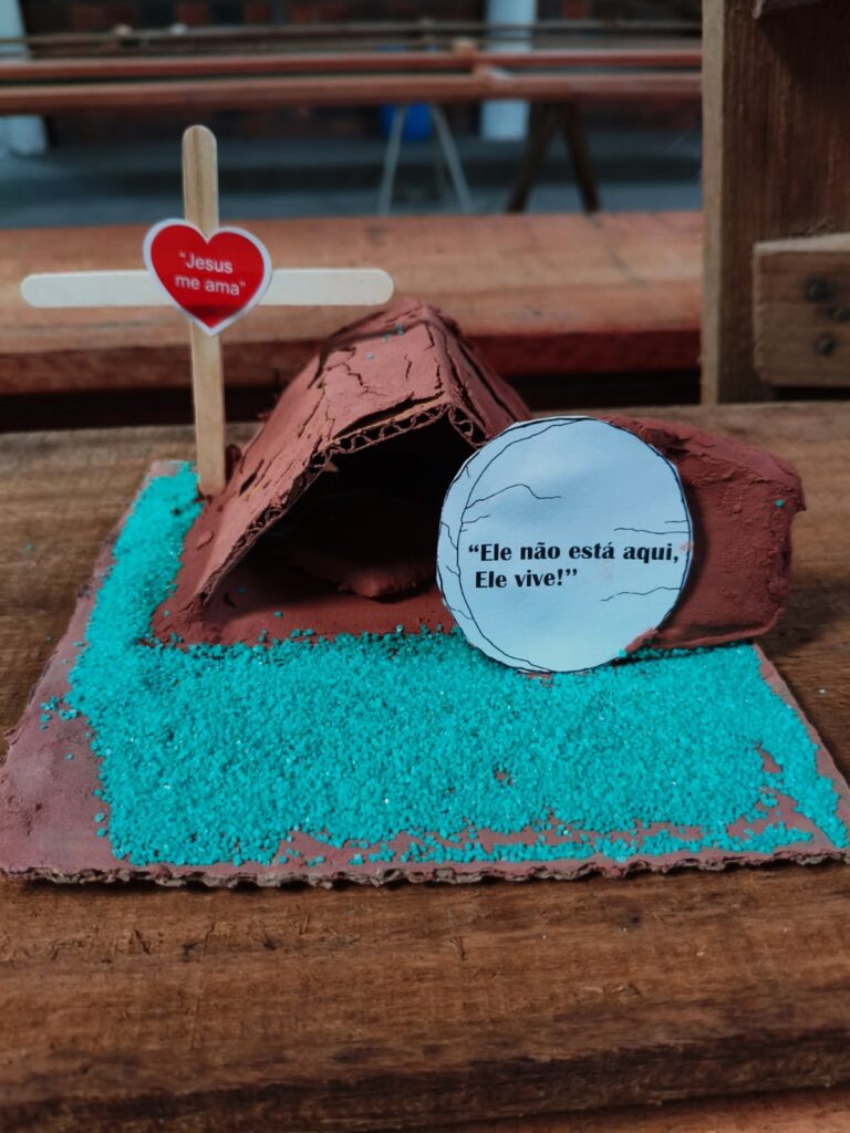 Conforme a ministra da paróquia, diácona Veridiane de Souza, com alegria e criatividade as crianças moldaram com suas próprias mãos o sepulcro de Jesus, relembrando o significado profundo desse tempo tão importante a fé cristã. “Mais do que uma atividade, foi um momento de aprendizado, reflexão e amor. Recordamos juntos que todo o sacrifício foi por nós. E que a maior de todas as alegrias é esta: Jesus ressuscitou, Ele vive e nos ama”, frisa.